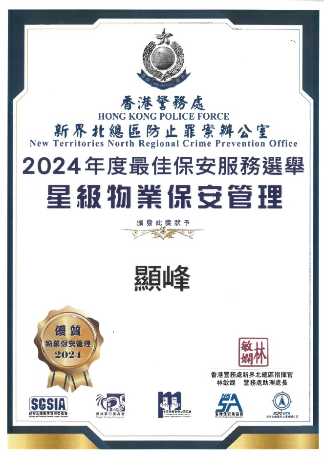 The properties managed by New City Property Management Co. Ltd have been honoured this year with two awards from the Hong Kong Police Force's New Territories North Regional Crime Prevention Office, including the 2024 Star-Rated Property Management Award and the Best Security Officer Award.